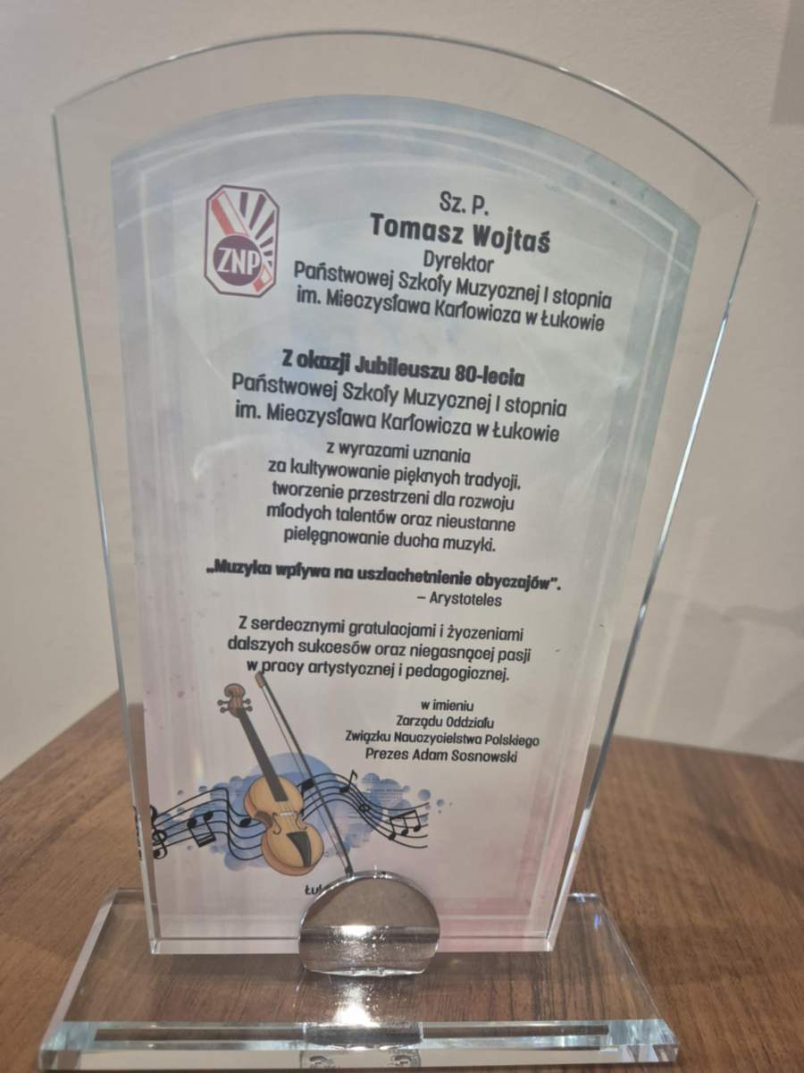 W imieniu Zarządu Oddziału ZNP w Łukowie głos zabrał Prezes Oddziału Pan Adam Sosnowski , składając życzenia dalszych sukcesów, twórczej energii oraz niegasnącej pasji w działalności artystycznej i pedagogicznej. Przekazał również pamiątkową statuetkę, wyrażając wdzięczność za wieloletnie kultywowanie tradycji muzycznych oraz wkład w rozwój kultury i edukacji w regionie.